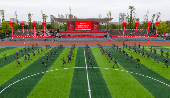 常德学院临时党委负责人、董事长欧成宣布军训成果展示正式开始。各军训方阵军容严整、步伐铿锵、口号嘹亮,充分展示了2025级新生昂扬向上的精神风貌和军训期间的训练成果。