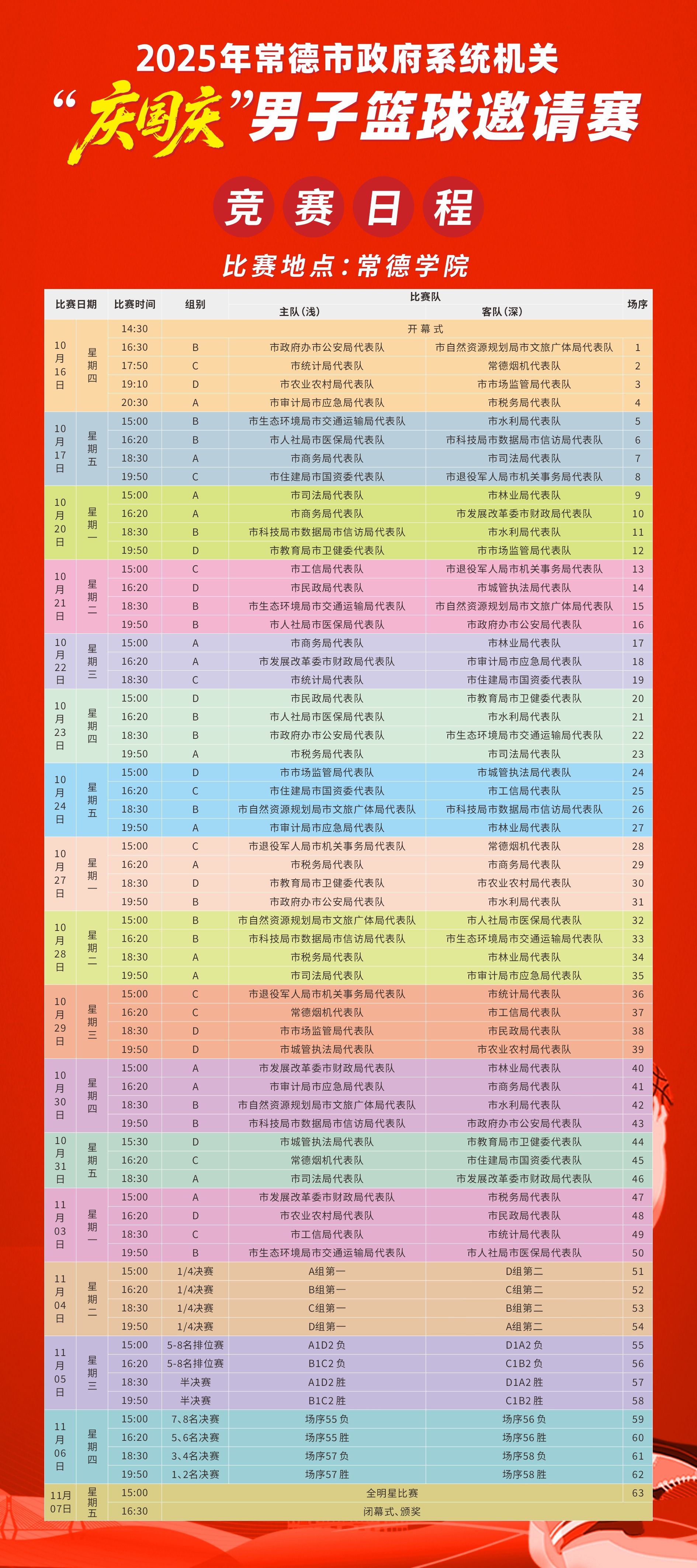 开幕式由赛事组委会主持,常德学院作为承办单位,将为本次比赛提供细致的服务保障。根据赛事安排,本次篮球赛将持续至11月7日,期间将进行小组赛、交叉淘汰赛及排位赛等多个阶段的激烈角逐。竞赛日程如下: