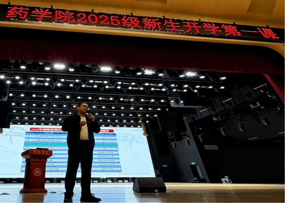 2025年9月23号晚上18:30药学院于精彩楼礼堂隆重举办了一场意义非凡的开学第一课活动。这场精心筹备的盛会,不仅是新生们正式踏入大学药学殿堂的重要里程碑,更是学院为身打造的“他们量启航指南”,旨在帮助新生们快速适应大学节奏,明确专业方向,深度激发对专业领域的探索欲与求知欲。活动现场气氛热烈,座无虚席。党支部书记唐松林、药学院副院长杨志勇担任主要发言人,学院老师共同参与了此次意义深远的开学第一课。