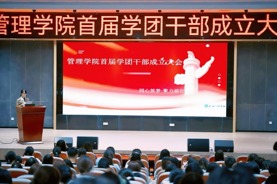 为进一步凝聚学生骨干力量,明确学团干部的职责与使命,推动学院学团工作迈向新高度,10月14日下午,管理学院首届学团干部成立大会在图书馆报告厅举行。此次大会以“同心筑梦·共赴远航”为主题,院领导、教师代表以及全体学团干部齐聚一堂,共同见证了这一重要时刻。