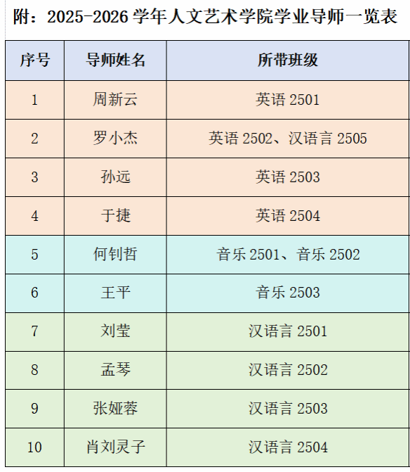 (通讯员 李扬希)为深入落实“立德树人”根本任务,构建“三全育人”协同机制,10月27日下午,人文艺术学院在精进楼304会议室隆重举行2025学年首届学业导师聘任会议。学院院长周新云教授、学生工作负责人李娅老师、全体受聘学业导师及班级学习委员代表齐聚一堂,共同见证这一育人重要时刻。会议由李扬希老师主持。