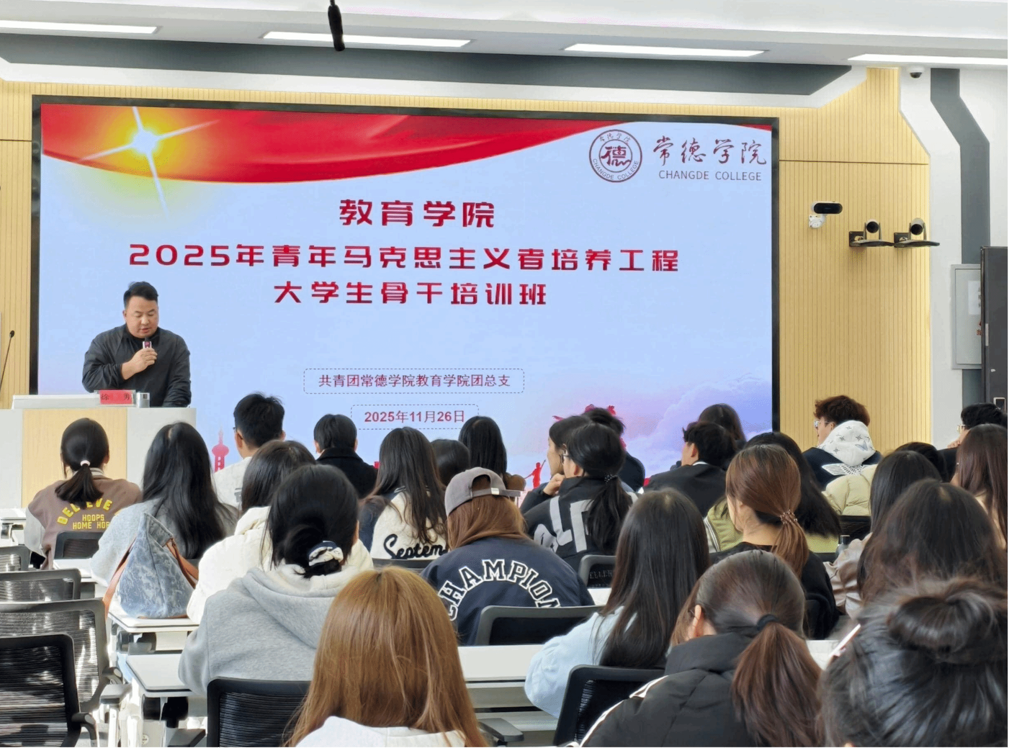 11月26日中午,常德学院教育学院2025年青年马克思主义者培养工程培训班开班仪式在精进429多媒体教室举行。教育学院院长李尚群出席仪式,辅导员徐勇、胥婷,教务干事刘文婷及全体参训学员参加活动。仪式由学生工作牵头人徐勇主持。徐勇介绍了本期培训班的整体安排和纪律要求,强调了此次培训的意义。