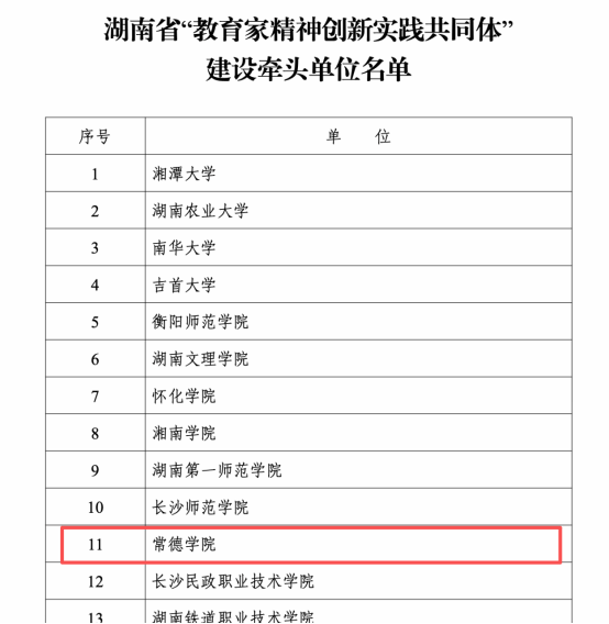 12月14日,省教育厅正式公布首批“教育家精神创新实践共同体”建设牵头单位名单。全省共遴选出28家牵头单位,常德学院凭借扎实的工作基础与鲜明特色,成功入选。