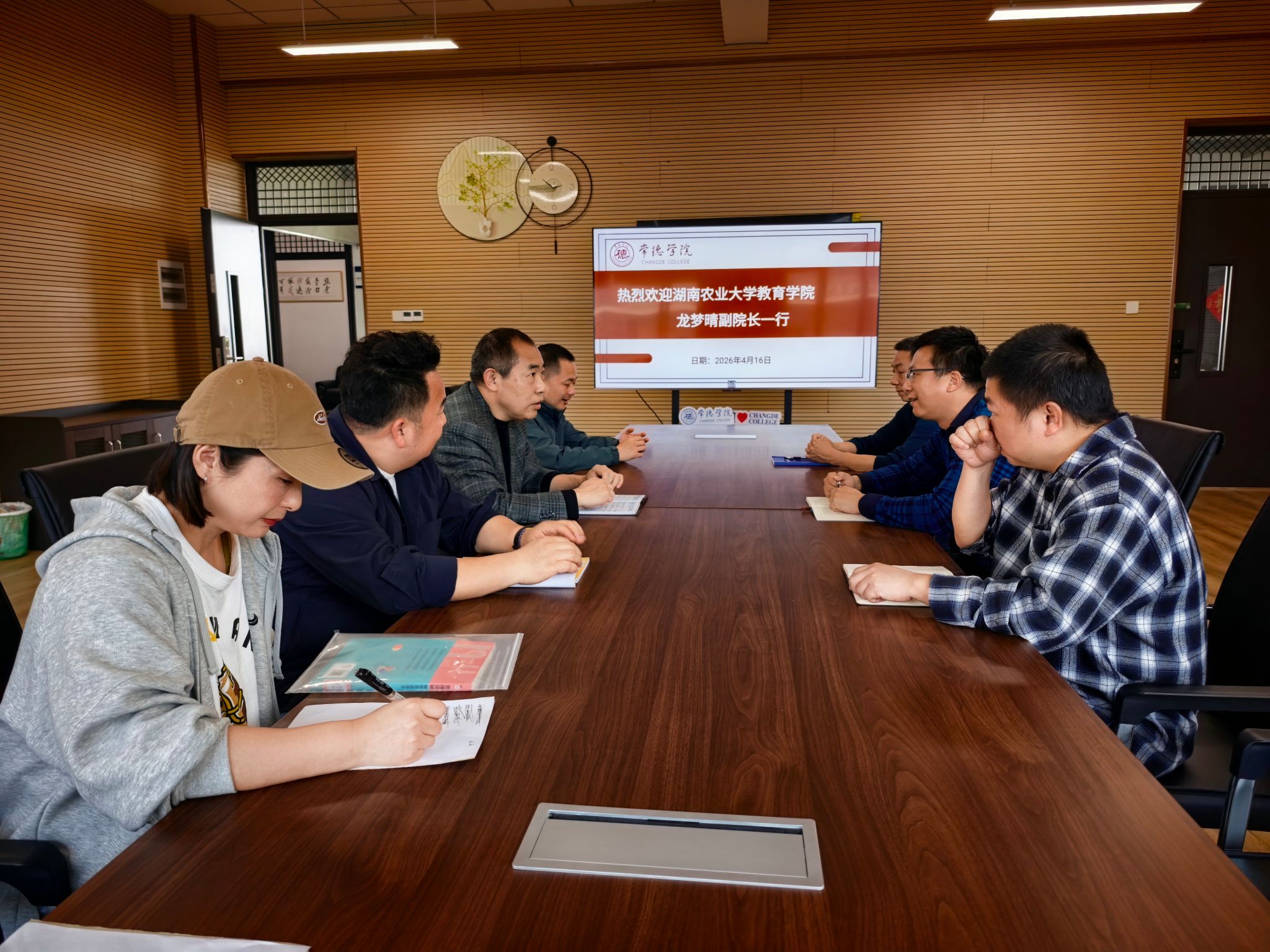 2026年4月16日,湖南农业大学教育学院副院长龙梦睛教授,培训办公室主任李鑫等一行访问教育学院。湖南农业大学教育学院成立于1986年,在职业教育师资的培养与培训方面特色鲜明,是全国重点建设的职业教育师资培训基地,拥有教育学国家一流本科专业、教育学一级学科硕士点和教育硕士专业学位点。