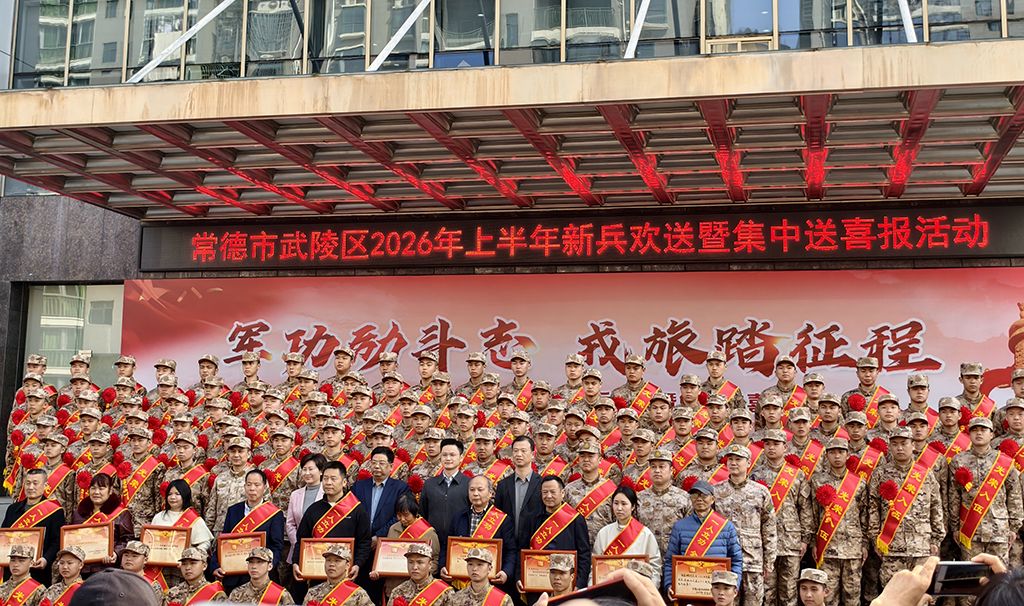 3月13日下午,常德市武陵区2026年上半年新兵欢送暨集中送喜报活动在区人武部院内庄严举行。现场气氛热烈,军歌嘹亮,来自信息学院的何朝德同学作为我校此次入伍新兵中首个在校大学生代表,胸戴红花、身披绶带,精神振奋、意气风发。他表示,将牢记嘱托、扎根军营、苦练本领,以青春之我报效祖国、服务人民。新兵欢送会现场学生处何筱老师、辅导员刘燕老师专程前往现场送行,代表全校师生表达深情祝福与殷切期望。得知何朝德即将奔赴军营的消息后,...