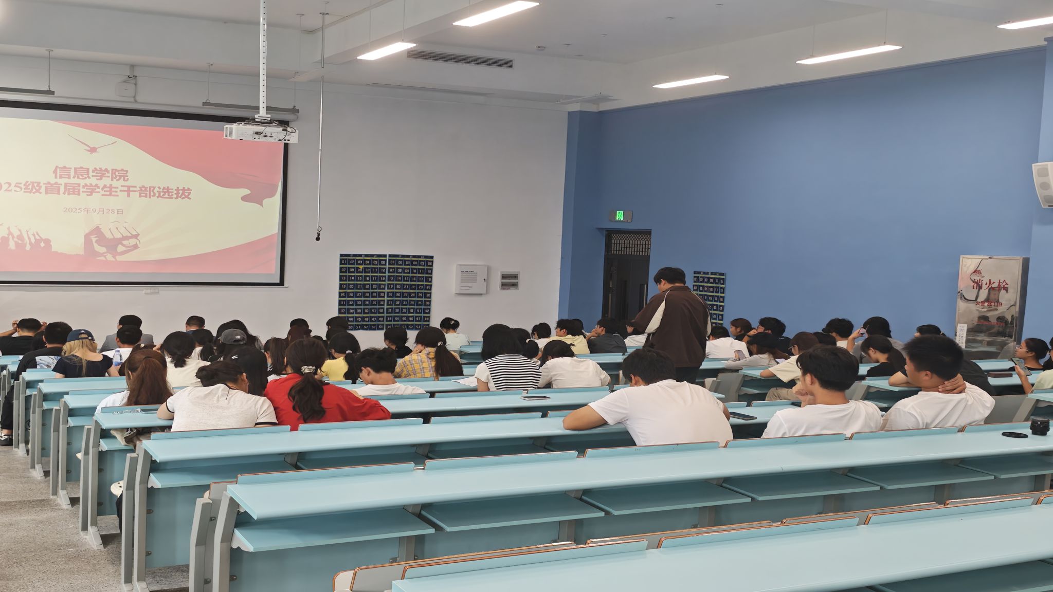 为加强学生组织建设,选拔一批政治坚定、能力突出、乐于服务的学生骨干,2025年9月28日,信息学院在精慧楼阶梯教室120举行2025级首届学生干部竞选活动。院长卓志宏,学工负责人晏臻,辅导员刘燕、胡丽、刘峻帆等出席并担任评委,百余名2025级新生参与角逐。