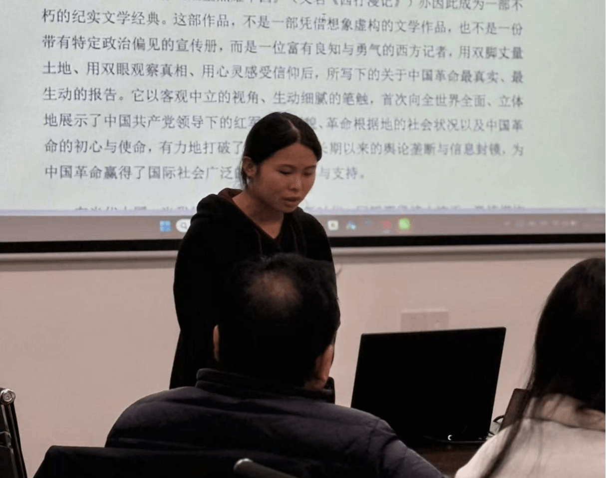 互动环节紧随其后,同学们围绕《红星照耀中国》的深层意蕴与德加·斯诺的独特观察视角,展开了热烈讨论。人文艺术学院黄历老师结合自身研究经验,向同学们提出博览群书与批判视角相融合的阅读建议。她指出,阅读经典要放在历史语境中“读其真”,结合专业领域“悟其理”,联系现实生活“践其行”。唯有如此,才能真正读懂经典、汲取成长启迪,让红色阅读不止于读,更在于悟与行。