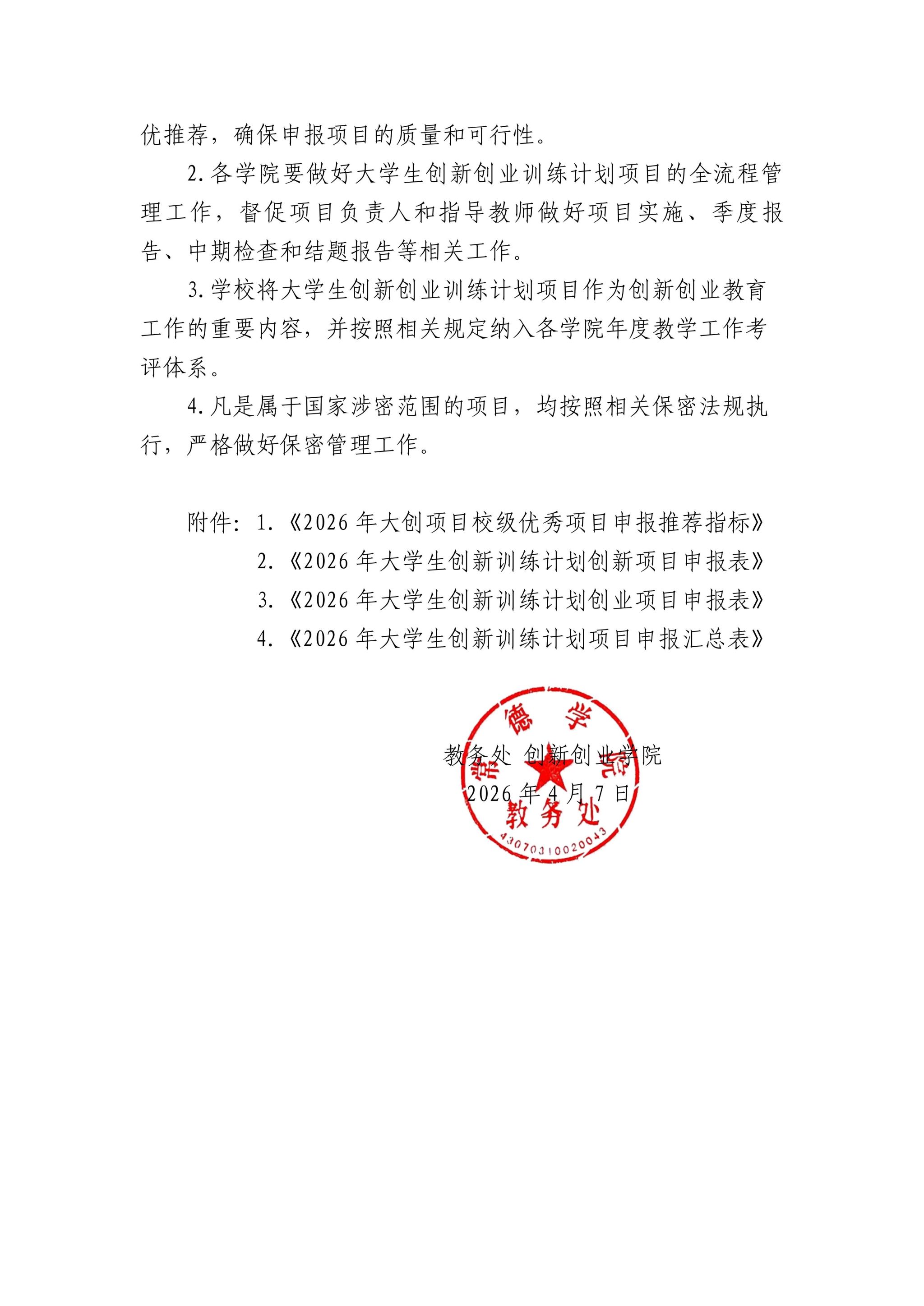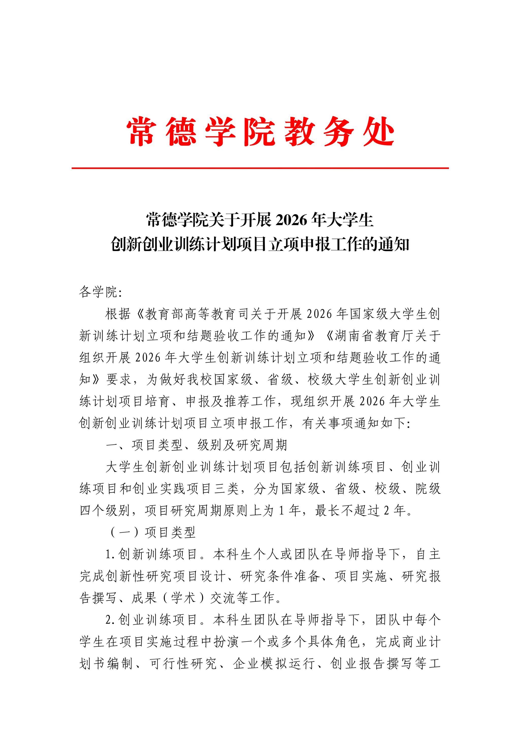 常德学院关于开展2026年大学生创新创业训练计划项目立项申报工作的通知