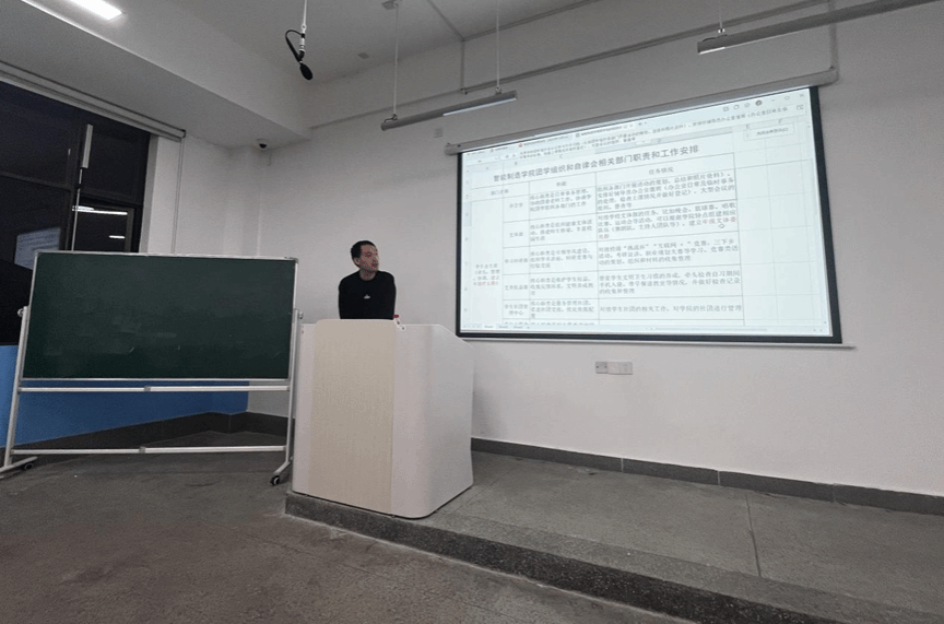 为加强学生干部队伍建设,提升组织凝聚力与执行力,2025年10月14日晚,智能制造学院在精工楼313多媒体教室召开2025级首届学生干部第一次会议。会议以“凝聚新力量,担当新使命,谱写新篇章,开创新局面”为主题,由彭赛男老师主持,学院院长刘晓林、全体辅导员、团学组织成员及大学生自律委员会成员共同参会,开启学生工作新篇章。