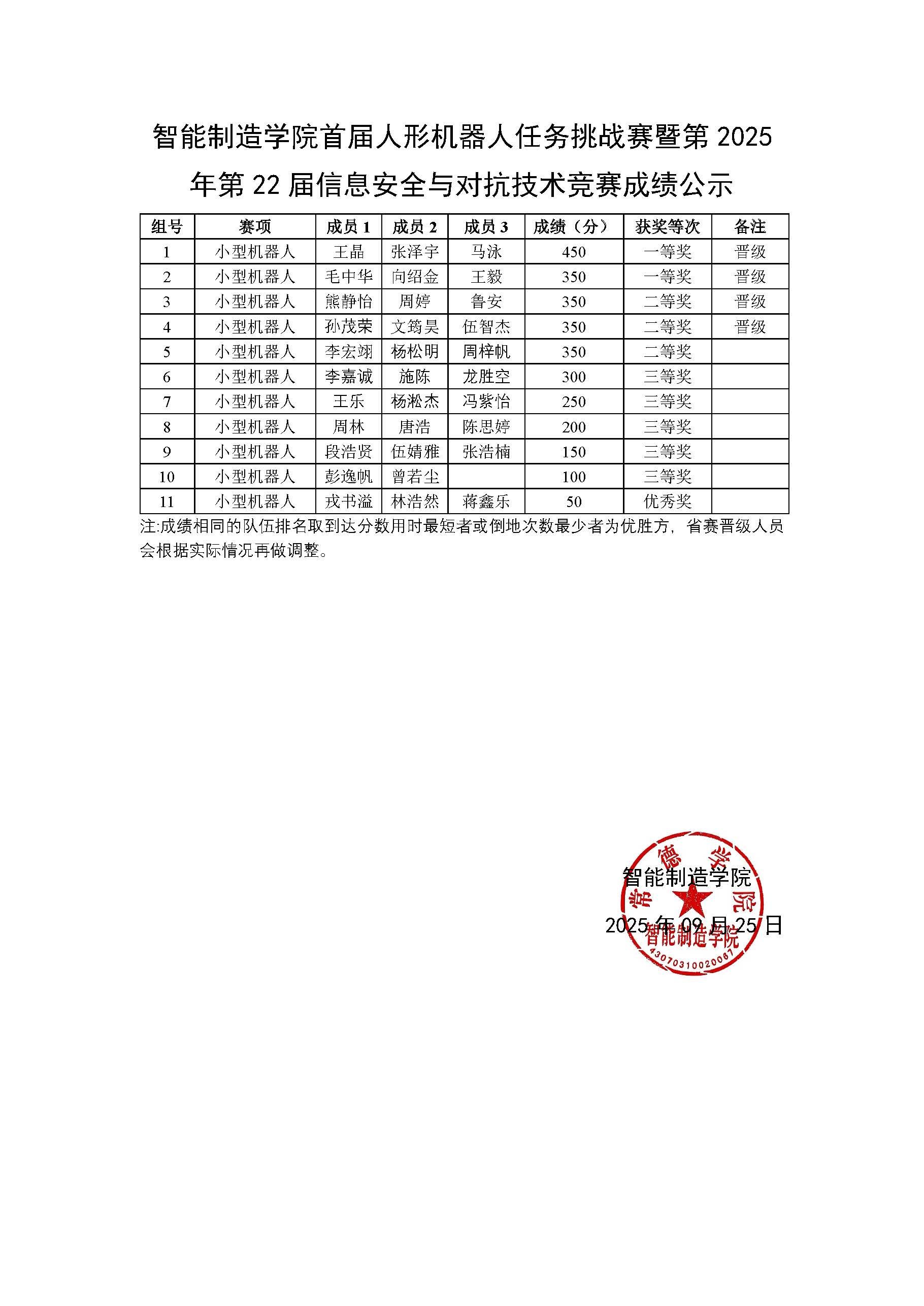 智能制造学院首届人形机器人任务挑战赛暨第2025年第22届信息安全与对抗技术竞赛成绩公示