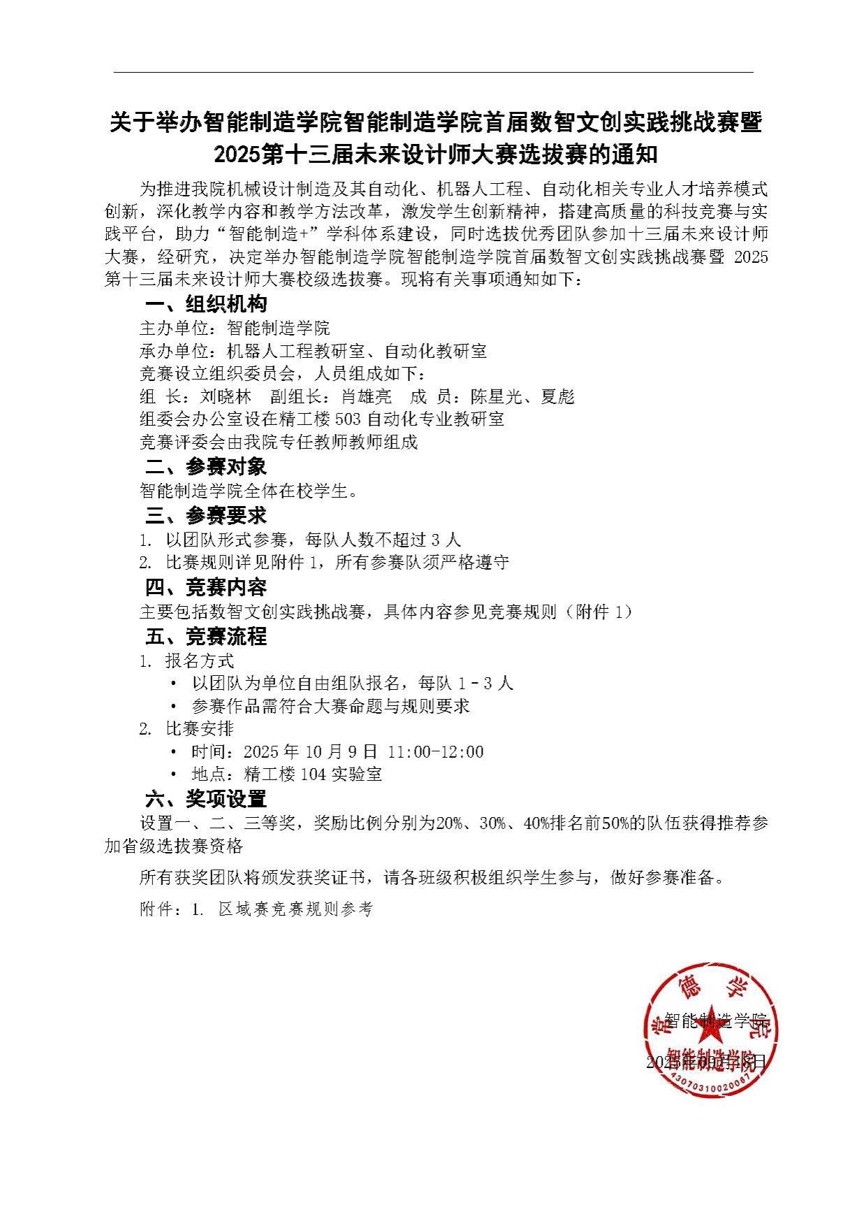 关于举办智能制造学院智能制造学院首届数智文创实践挑战赛暨2025第十三届未来设计师大赛选拔赛的通知